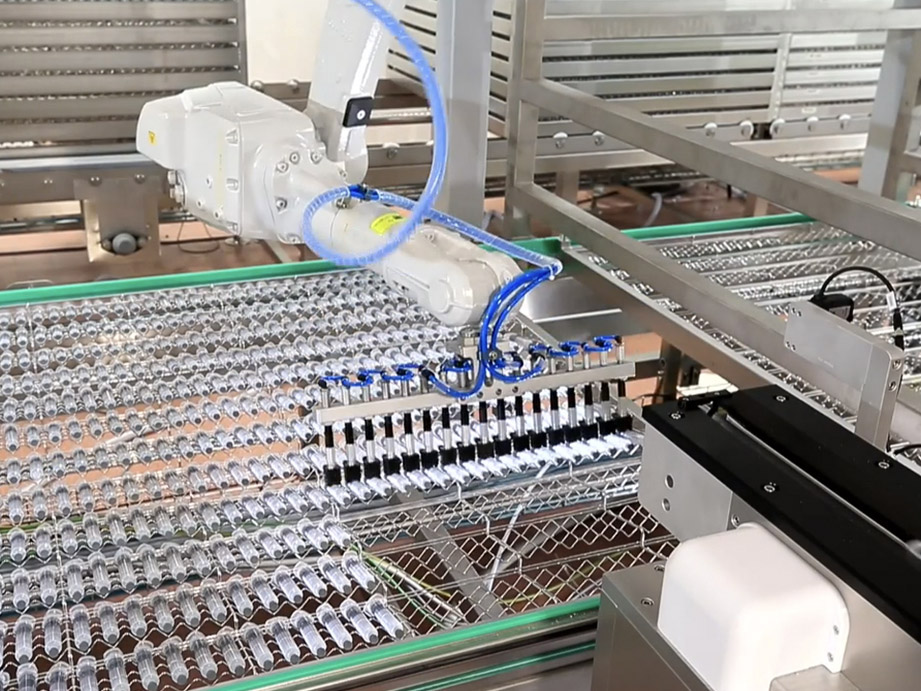 Robots positively pick and place the syringes into the stainless trays, which are indexed to the sterilization process downstream after being loaded. After sterilization, the process is reversed and the trays are unloaded, where the syringes are renested into tubs.